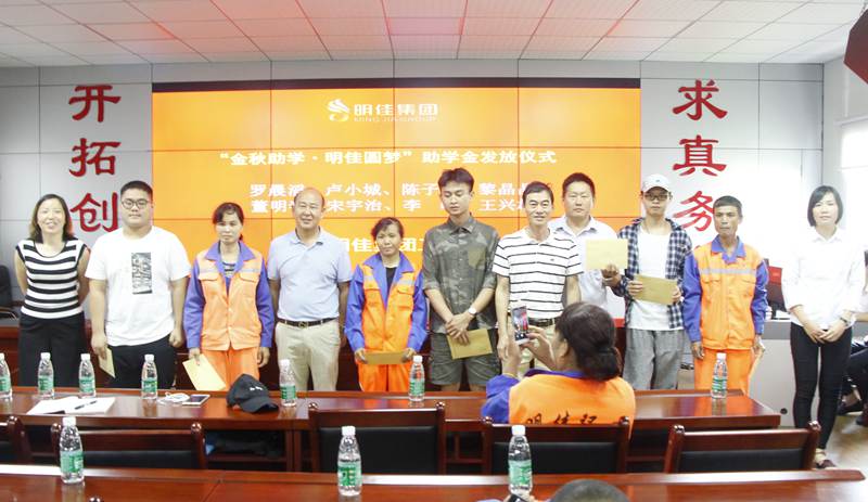 8月28日上午,明佳集團(tuán)工會(huì)“金秋助學(xué)·明佳圓夢”助學(xué)金發(fā)放儀式在集團(tuán)公司三樓會(huì)議室舉行,為8個(gè)考取大學(xué)的職工子女發(fā)放助學(xué)金共計(jì)9600元?偛藐愒、副總經(jīng)理鐘寒參加發(fā)放儀式,儀式由工會(huì)主席高斐斐主持。