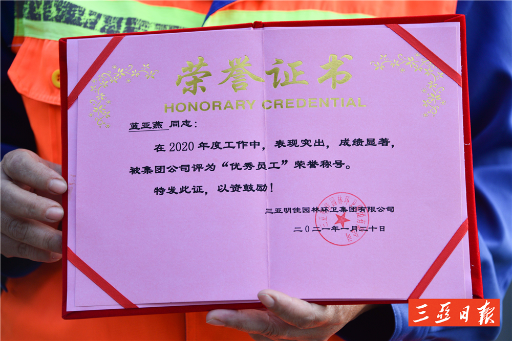 “亞燕是一個工作負責、認真的員工,她工作讓我很放心,平時她還主動幫助其他工人,累活也搶著干!泵骷循h(huán)衛(wèi)天涯一隊隊長林海菊這樣評價藍亞燕。