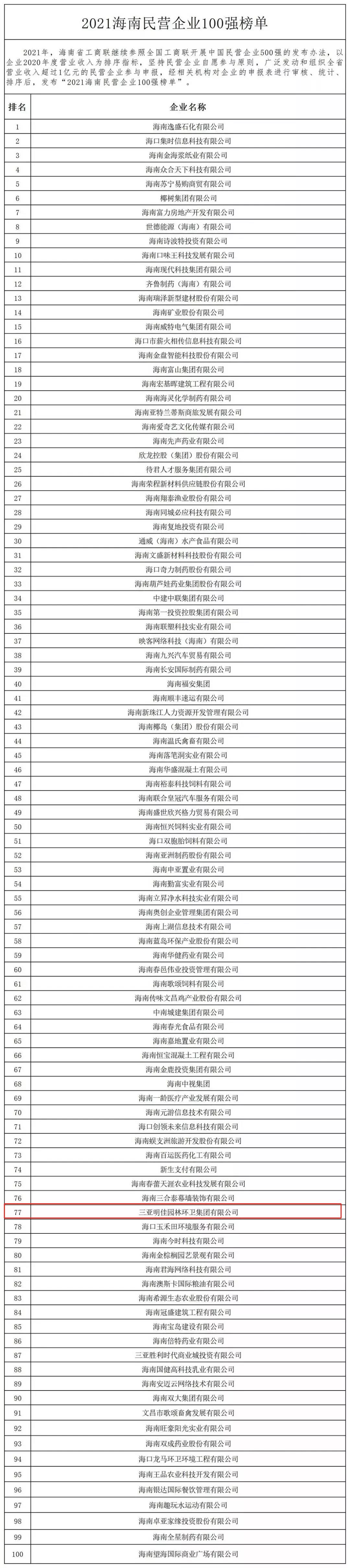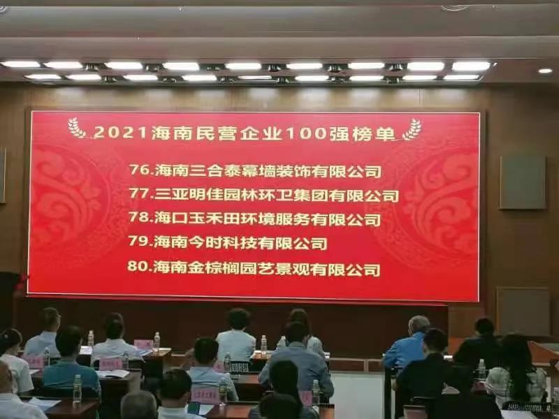 11月4日,海南省工商業(yè)聯(lián)合會(huì)在海口發(fā)布“2021海南民營(yíng)企業(yè)100強(qiáng)”榜單。三亞明佳園林環(huán)衛(wèi)集團(tuán)有限公司2019至2021年連續(xù)三年入選海南民營(yíng)企業(yè)100強(qiáng)。